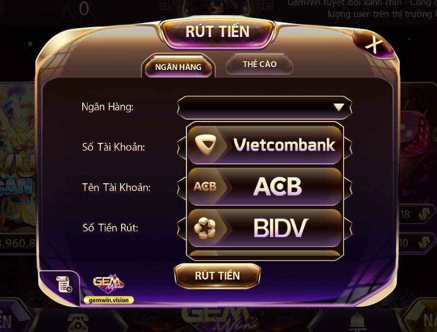 - Hỗ trợ đa dạng ngân hàng: Anh em có thể rút tiền từ Gemwin về hầu hết các ngân hàng lớn tại Việt Nam, không gặp bất kỳ rào cản nào về mặt thanh toán.